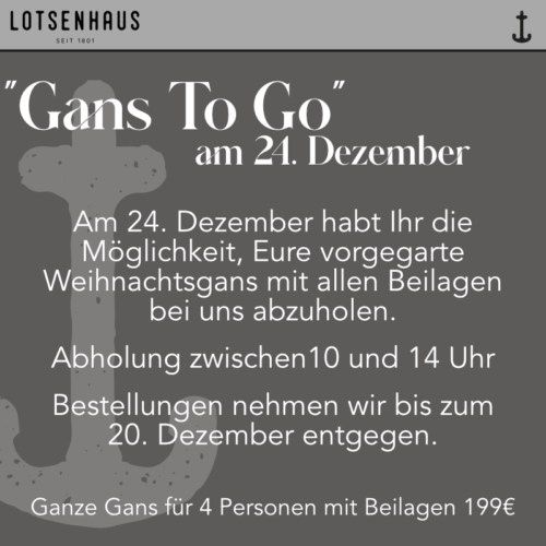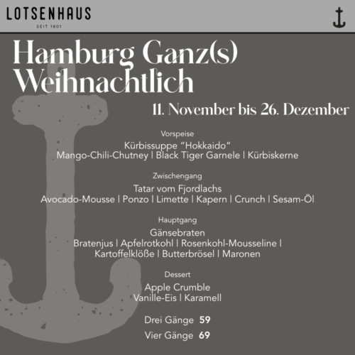 Ab dem 11. November gibt es wieder unser beliebtes Gänsemenü im Rahmen der Menüaktion „Hamburg Ganz(s) Weihnachtlich“. Auf Vorbestellung bieten wir selbstverständlich auch wieder unsere ganze Gans für vier Personen an.